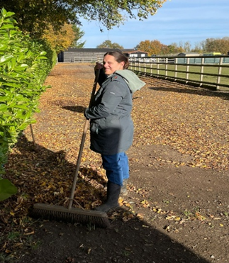 Bettina takes pride in clearing the autumnal leaves from the entrance to the farm.